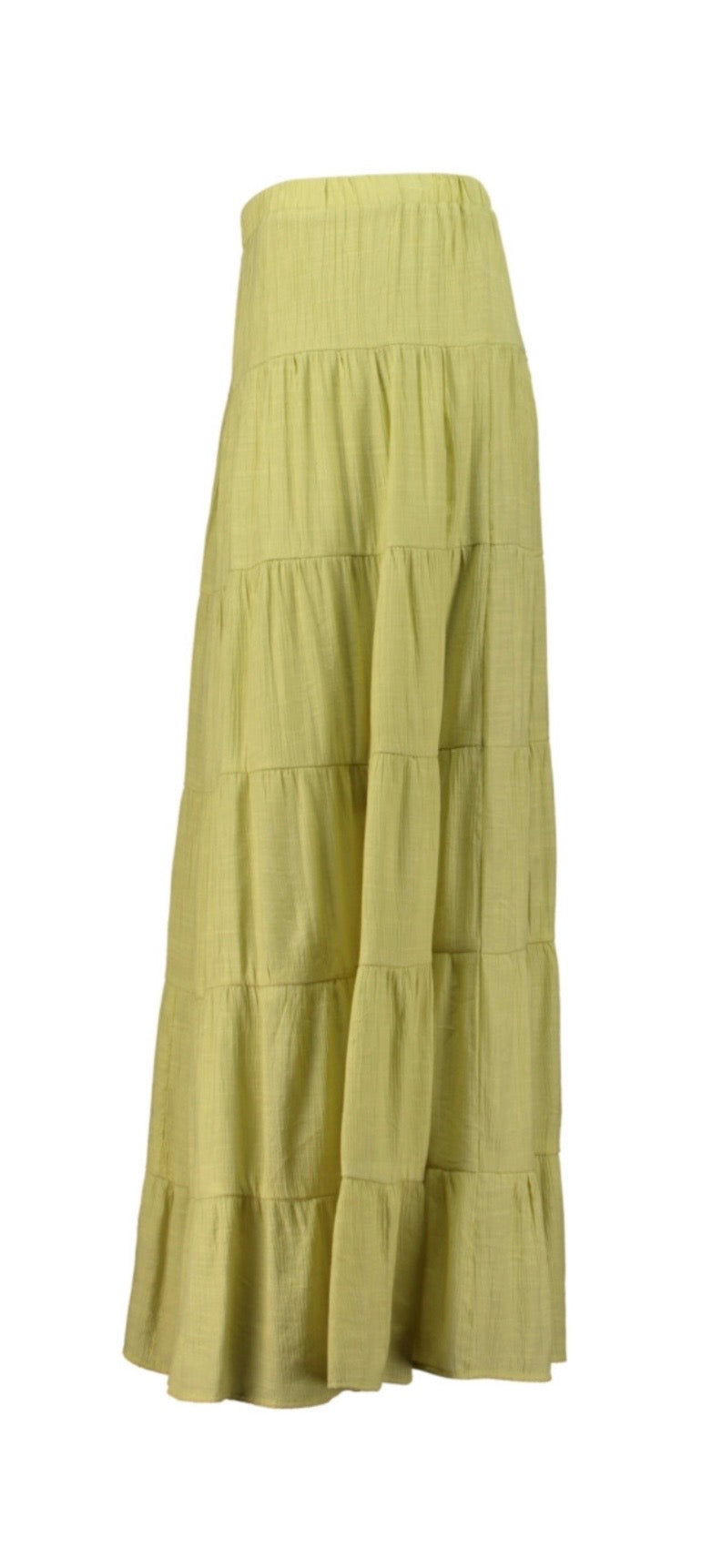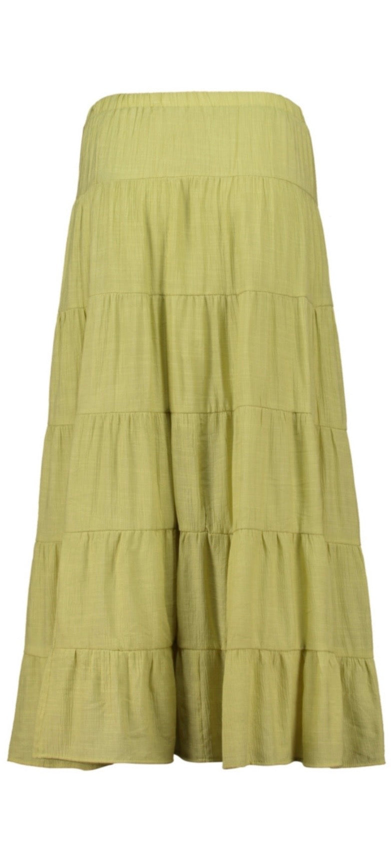 Der fließende Maxirock in softem Olivgrün bringt sofort entspannte Boho-Vibes in deinen Look. Die gestuften Volants sorgen für Bewegung und Leichtigkeit, während der elastische Bund maximalen Komfort garantiert.