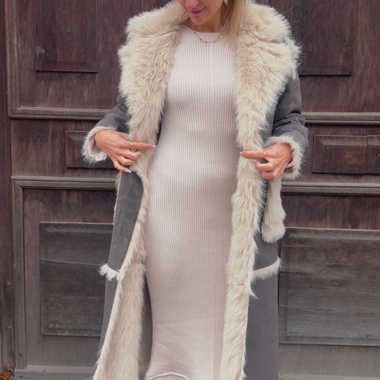 Elegante Winterjacke mit Faux-Fur-Besatz – Langer Damenmantel in Grau mit Bindegürtel