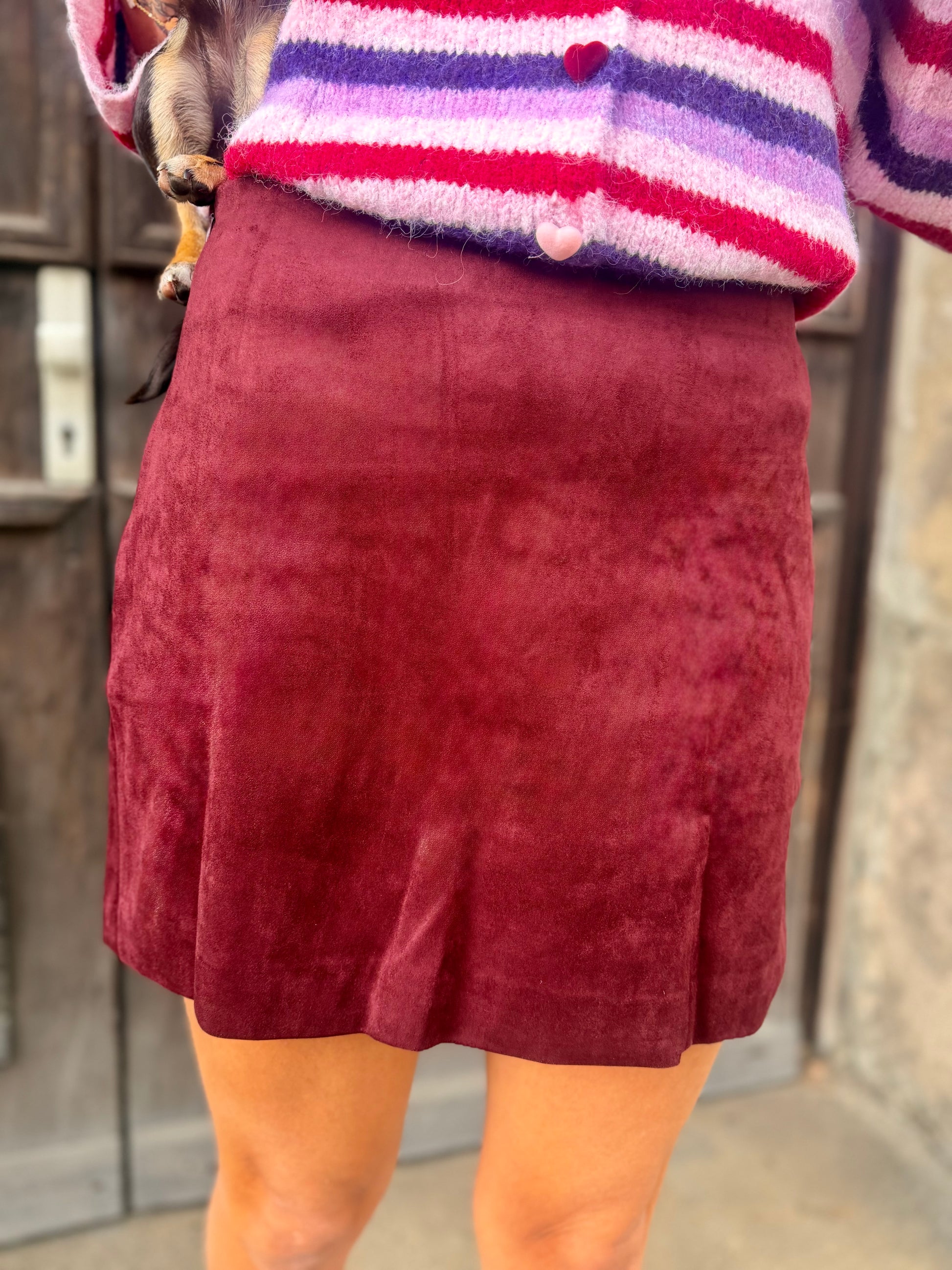 Der Minirock in Wildleder-Optik ist ein elegantes Basic mit Trendfaktor. Sein samtig-weiches Material in sattem Weinrot sorgt für einen luxuriösen Look, während der schmale Schnitt die Figur perfekt betont. Ob chic mit Strick oder edgy mit Lederjacke – dieser Rock ist ein echtes Allround-Talent.