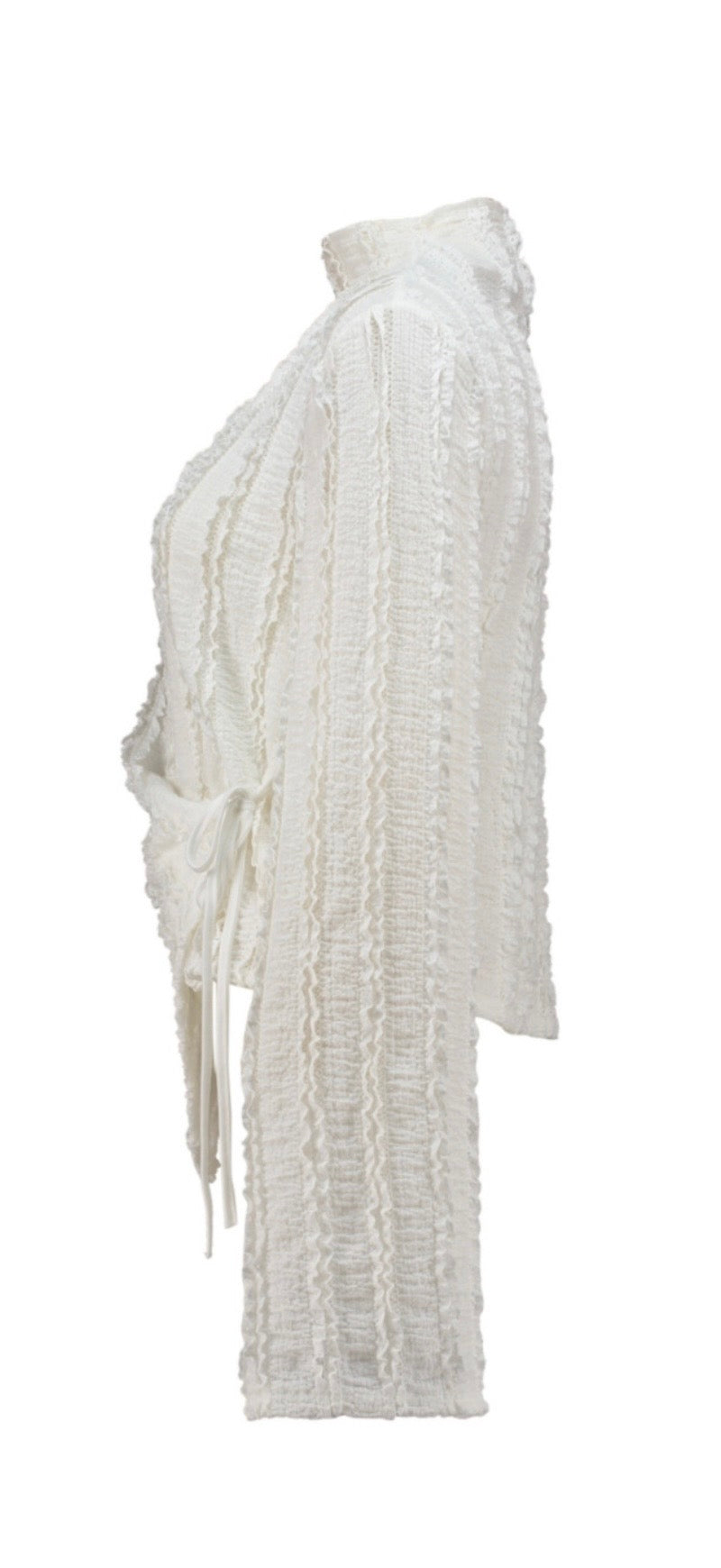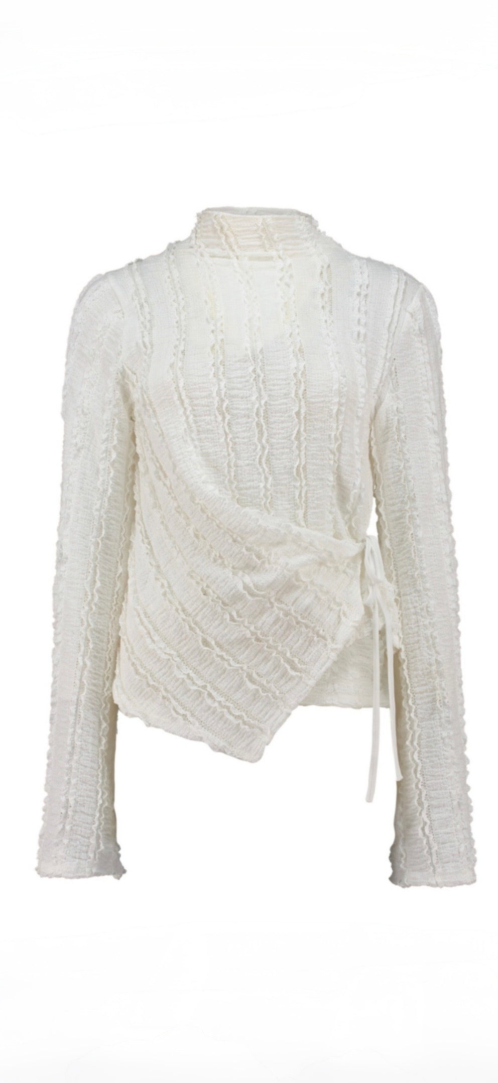 Dieses strukturierte Langarm-Top in Offwhite hebt dein Outfit sofort auf ein neues Level. Die feine, leicht transparente Struktur trifft auf ein modernes Wickeldetail mit Bindung, das deine Silhouette betont und dem Look eine elegante Note verleiht.