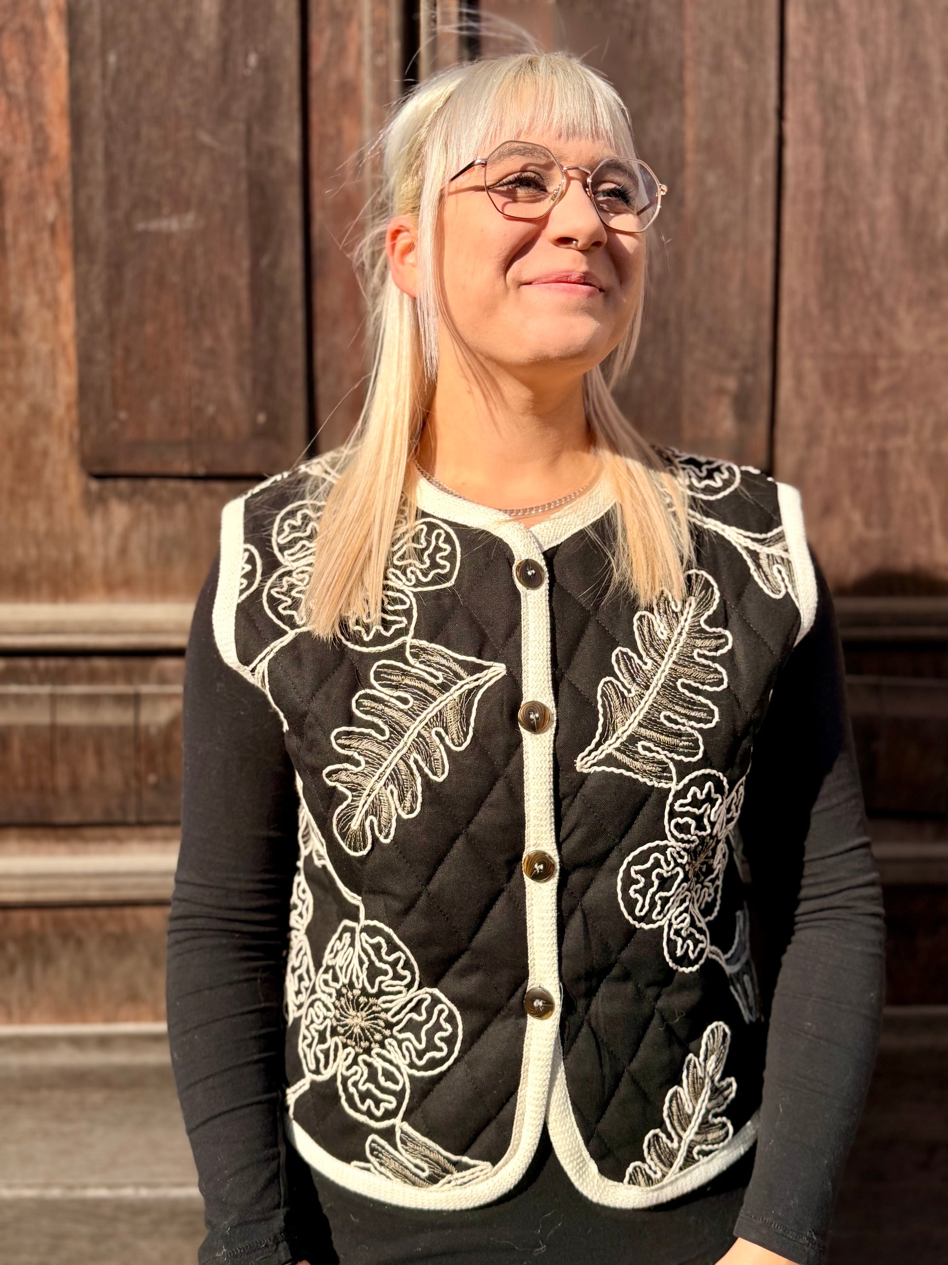 Gestepptes Weste mit Blumenstickerei – Schwarz/Beige